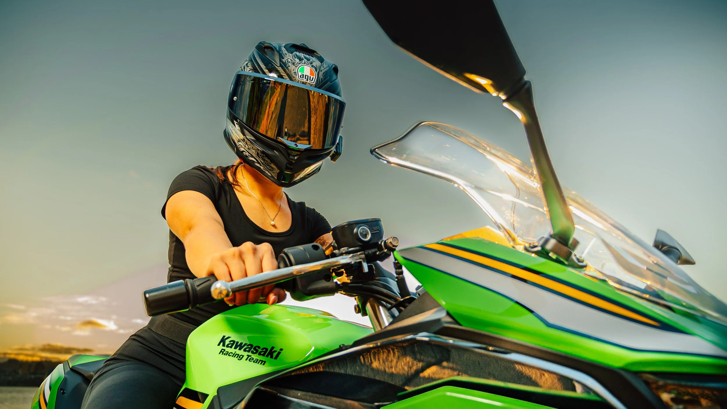Isabel arrived with a kind of calm excitement, the sort of presence that makes a photographer’s job easier before a camera is even raised. She wheeled her green Kawasaki Ninja into the late sun, the bike’s metallic surfaces immediately catching the warm edge of daylight. Beside it sat her other object of automotive pride: a sleek, gun-metal Honda Accord.