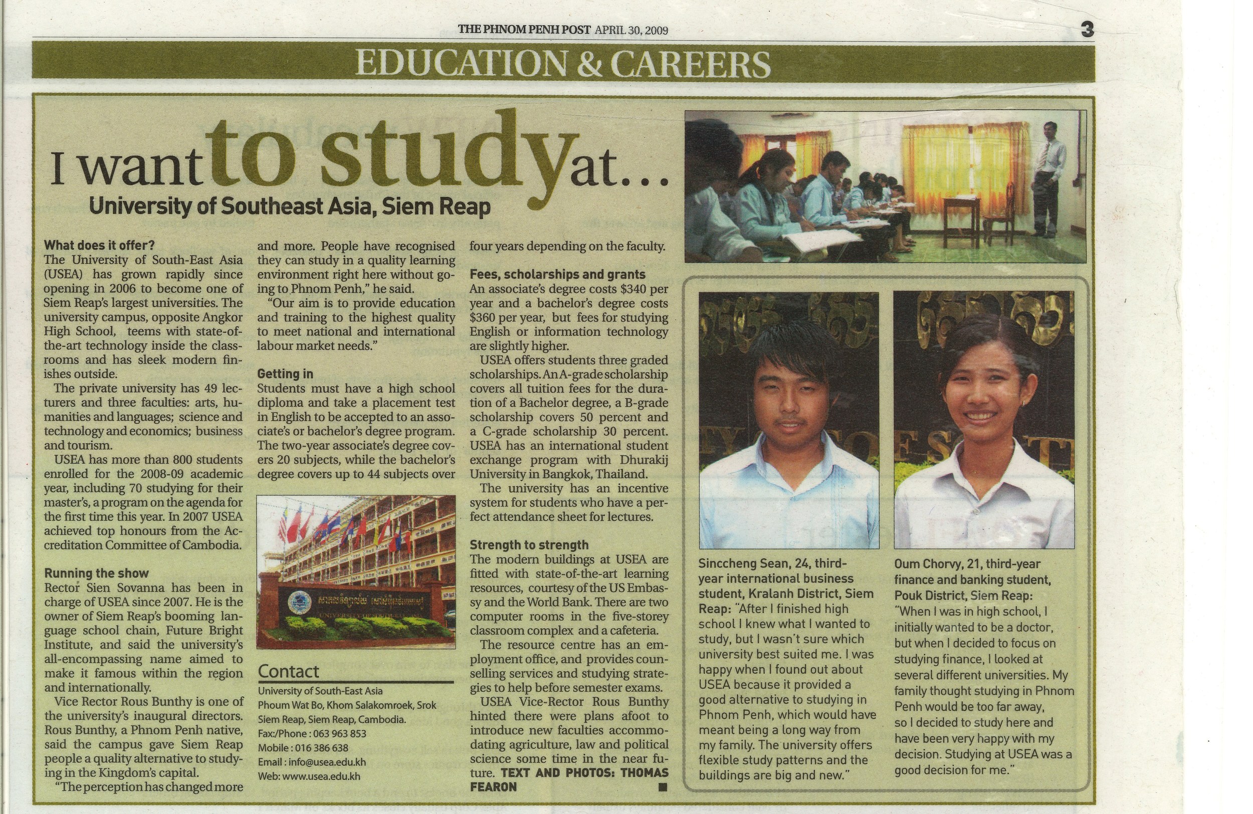 The University of South-East Asia (USEA) has grown rapidly since opening in 2006 to become one of Siem Reap's largest universities. The university campus, opposite Angkor High School, teems with state-of-the-art technology inside the classrooms and has sleek modern finishes outside.